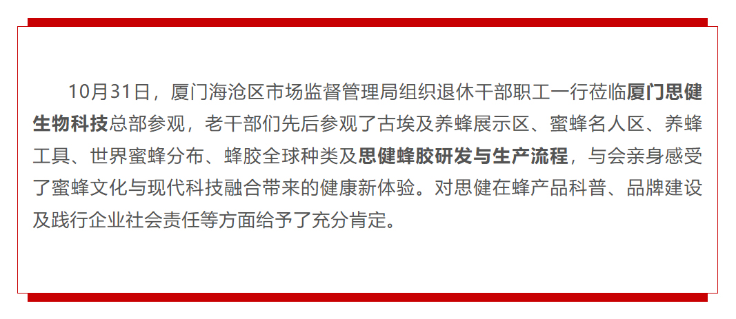思健科技動態(tài) | 海滄市場監(jiān)督管理局退休干部職工參觀思健蜂主題科技館及蜂膠生產(chǎn)車間